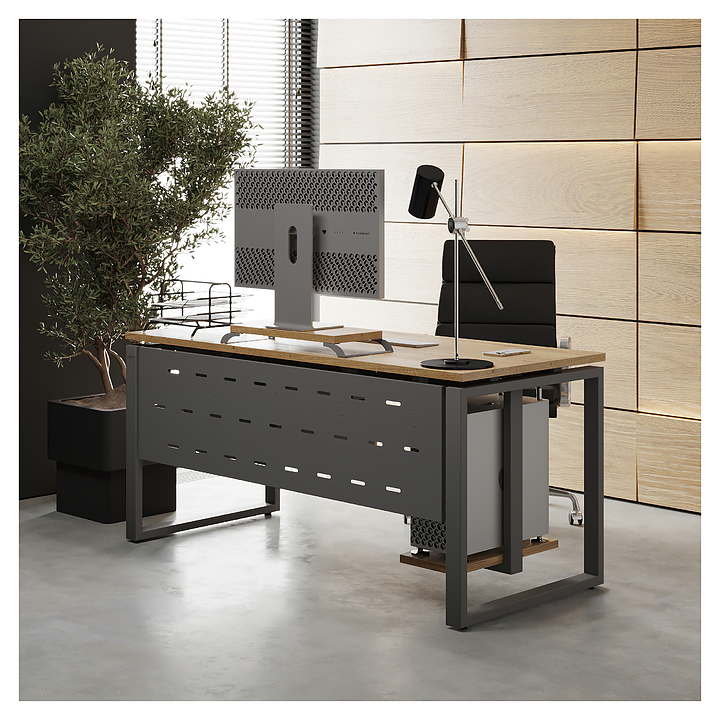 Офисный стол Кобор O1-180/60 aluminum/natural используется в офисных помещениях и кабинетах руководителей. Модель оснащена O-образными опорами. Каркас выполнен из металла, выкрашенного в цвет алюминиевый металлик (RAL9006), столешница – из ламинированной древесно-стружечной плиты (ЛДСП) цвета натуральный дуб (H1180 ST37). Опции (заказываются отдельно):