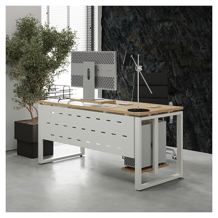 Офисный стол Кобор O1-100/60 white/natural используется в офисных помещениях и кабинетах руководителей. Модель оснащена O-образными опорами. Каркас выполнен из металла, выкрашенного в цвет белый муар (RAL9016), столешница – из ламинированной древесно-стружечной плиты (ЛДСП) цвета натуральный дуб (H1180 ST37). Опции (заказываются отдельно):