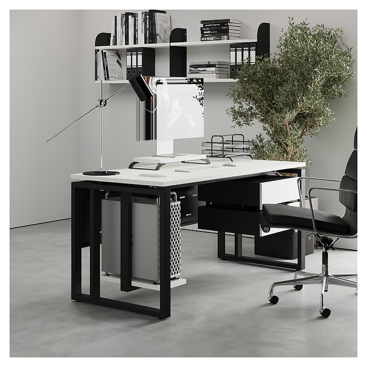 Офисный стол Кобор O2-160/80 black/premium используется в офисных помещениях и кабинетах руководителей. Модель оснащена усиленными вертикальной балкой O-образными опорами. Каркас выполнен из металла, выкрашенного в цвет черный муар (RAL9005), столешница – из ламинированной древесно-стружечной плиты (ЛДСП) цвета белый премиум (W1000 S9). Опции (заказываются отдельно):