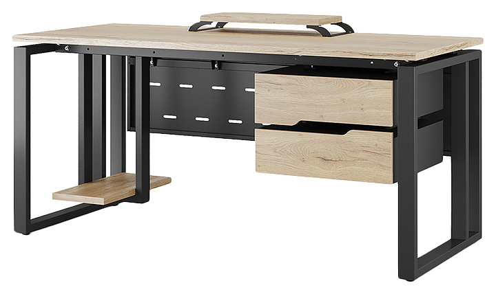 Офисный стол Кобор O2-160/80 black/natural используется в офисных помещениях и кабинетах руководителей. Модель оснащена усиленными вертикальной балкой O-образными опорами. Каркас выполнен из металла, выкрашенного в цвет черный муар (RAL9005), столешница – из ламинированной древесно-стружечной плиты (ЛДСП) цвета натуральный дуб (H1180 ST37). Опции (заказываются отдельно):