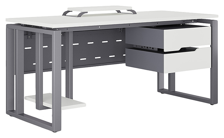 Офисный стол Кобор O2-140/70 graphite/premium используется в офисных помещениях и кабинетах руководителей. Модель оснащена усиленными вертикальной балкой O-образными опорами. Каркас выполнен из металла, выкрашенного в цвет графит муар (RAL7024), столешница – из ламинированной древесно-стружечной плиты (ЛДСП) цвета белый премиум (W1000 ST9). Опции (заказываются отдельно):
