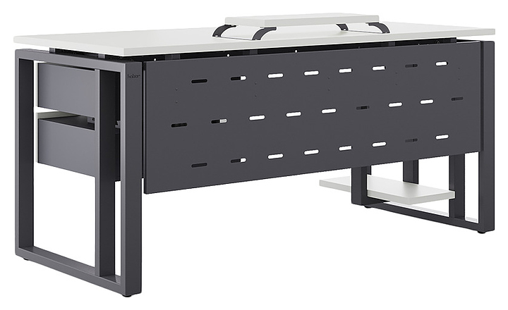 Офисный стол Кобор O2-180/70 graphite/premium используется в офисных помещениях и кабинетах руководителей. Модель оснащена усиленными вертикальной балкой O-образными опорами. Каркас выполнен из металла, выкрашенного в цвет графит муар (RAL7024), столешница – из ламинированной древесно-стружечной плиты (ЛДСП) цвета белый премиум (W1000 ST9). Опции (заказываются отдельно):