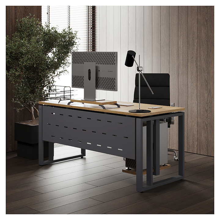 Офисный стол Кобор O2-180/80 graphite/natural используется в офисных помещениях и кабинетах руководителей. Модель оснащена усиленными вертикальной балкой O-образными опорами. Каркас выполнен из металла, выкрашенного в цвет графит муар (RAL7024), столешница – из ламинированной древесно-стружечной плиты (ЛДСП) цвета натуральный дуб (H1180 ST37). Опции (заказываются отдельно):
