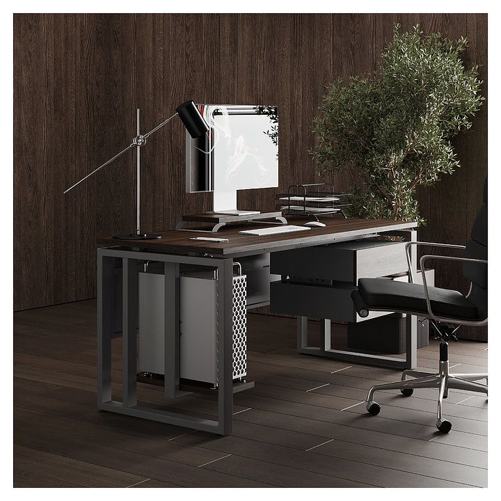 Офисный стол Кобор O2-120/60 aluminum/charlston используется в офисных помещениях и кабинетах руководителей. Модель оснащена усиленными вертикальной балкой O-образными опорами. Каркас выполнен из металла, выкрашенного в цвет алюминиевый металлик (RAL9006), столешница – из ламинированной древесно-стружечной плиты (ЛДСП) цвета дуб чарльстон (H3154 ST36). Опции (заказываются отдельно):
