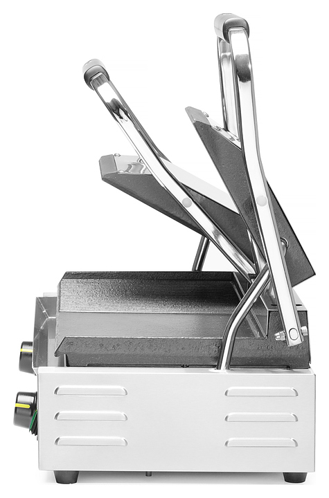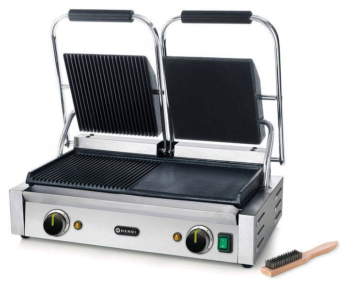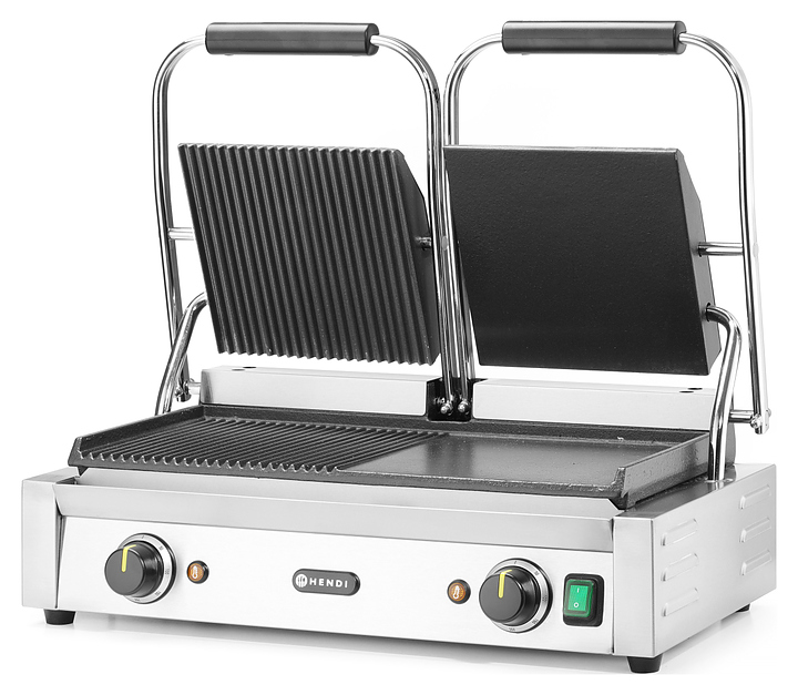 Контактный гриль HENDI 263907 предназначен для жарки мяса, птицы, рыбы, овощей, а также для приготовления стейков, сосисок, гамбургеров и горячих сэндвичей на предприятиях общественного питания и торговли. Модель оснащена 2 независимо управляемыми термостатами, электромеханической панелью управления, сетевым выключателем, со встроенным индикатором, индикатором предварительного нагрева и кабелем питания с заземленной вилкой. Корпус выполнен из нержавеющей стали 18/10, ручки - из термостойкого материала, жарочные поверхности - из чугуна и имеют эмалированное покрытие. В комплект поставки входит щетка для легкой очистки. Особенности: