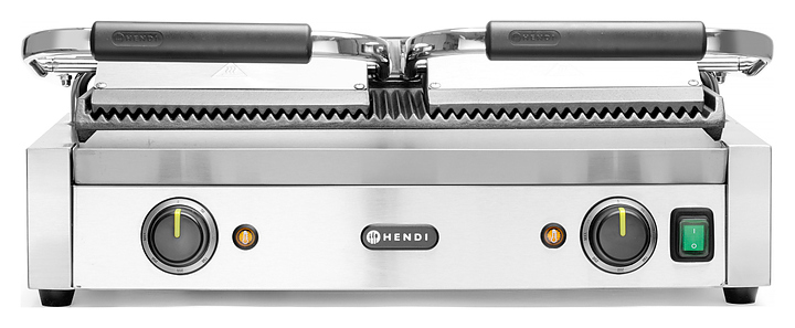 Контактный гриль HENDI 263709 предназначен для жарки мяса, птицы, рыбы, овощей, а также для приготовления стейков, сосисок, гамбургеров и горячих сэндвичей на предприятиях общественного питания и торговли. Модель оснащена 2 независимо управляемыми термостатами, электромеханической панелью управления, сетевым выключателем, со встроенным индикатором, индикатором предварительного нагрева и кабелем питания с заземленной вилкой. Корпус выполнен из нержавеющей стали 18/10, ручки - из термостойкого материала, жарочные поверхности - из чугуна и имеют эмалированное покрытие. В комплект поставки входит щетка для легкой очистки. Особенности: