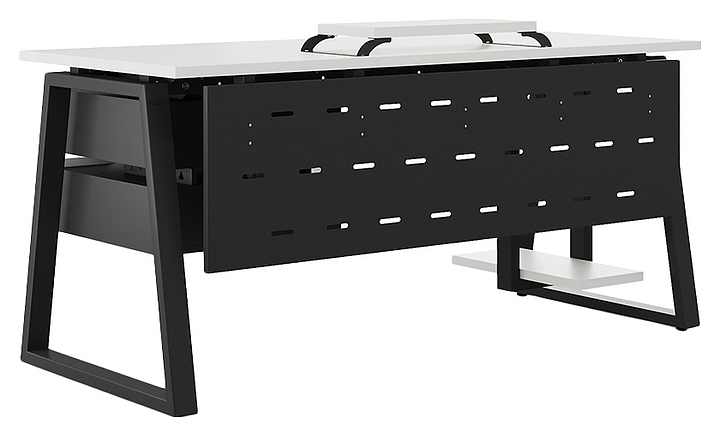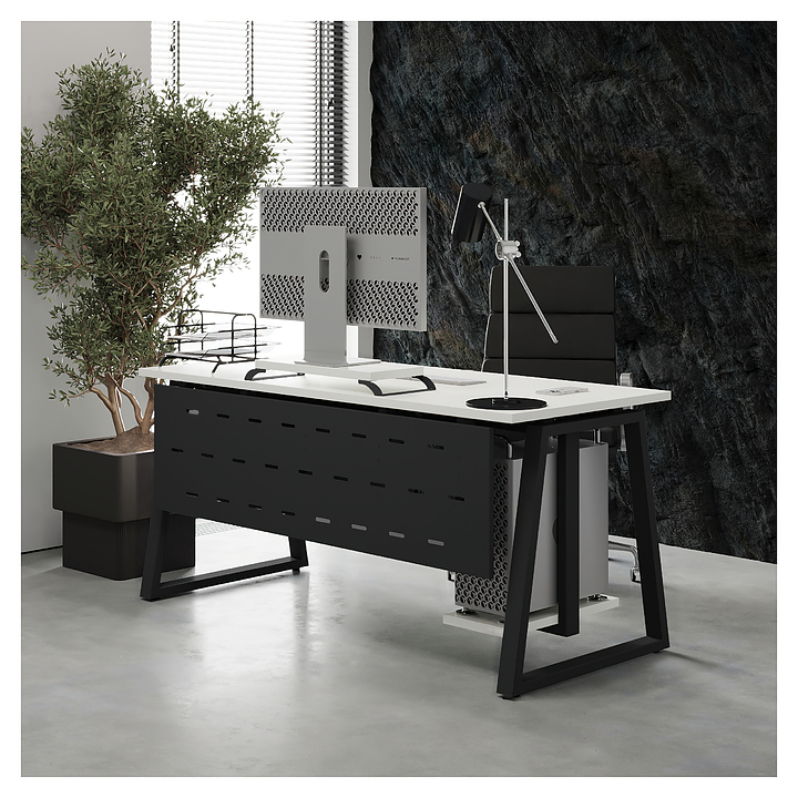 Офисный стол Кобор TR-180/70 black/premium используется в офисных помещениях и кабинетах руководителей. Модель оснащена опорами в форме трапеции. Каркас выполнен из металла, выкрашенного в цвет черный муар (RAL9005), столешница – из ламинированной древесно-стружечной плиты (ЛДСП) цвета белый премиум (W1000 S9). Опции (заказываются отдельно):