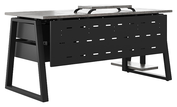 Офисный стол Кобор TR-100/80 black/chicago используется в офисных помещениях и кабинетах руководителей. Модель оснащена опорами в форме трапеции. Каркас выполнен из металла, выкрашенного в цвет черный муар (RAL9005), столешница – из ламинированной древесно-стружечной плиты (ЛДСП) цвета бетон чикаго (F186 ST9). Опции (заказываются отдельно):