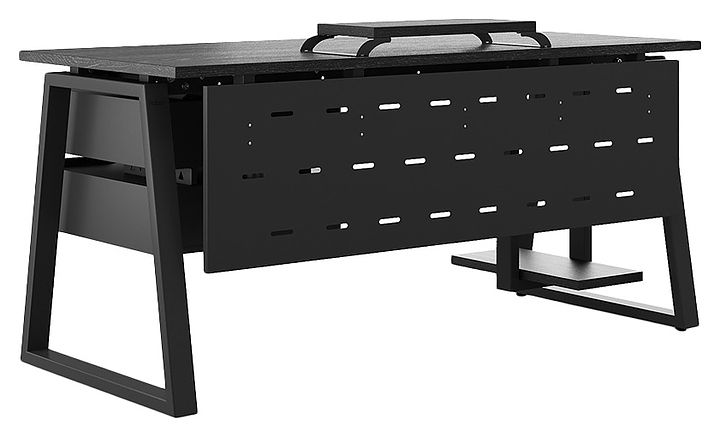 Офисный стол Кобор TR-120/70 black/glazed используется в офисных помещениях и кабинетах руководителей. Модель оснащена опорами в форме трапеции. Каркас выполнен из металла, выкрашенного в цвет черный муар (RAL9005), столешница – из ламинированной древесно-стружечной плиты (ЛДСП) цвета черный дуб (H3178 ST37). Опции (заказываются отдельно):
