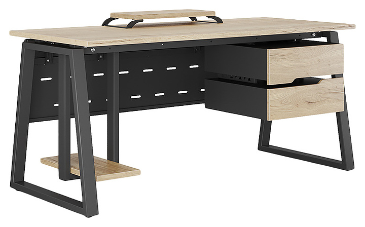 Офисный стол Кобор TR-140/70 black/natural используется в офисных помещениях и кабинетах руководителей. Модель оснащена опорами в форме трапеции. Каркас выполнен из металла, выкрашенного в цвет черный муар (RAL9005), столешница – из ламинированной древесно-стружечной плиты (ЛДСП) цвета натуральный дуб (H1180 ST37). Опции (заказываются отдельно):