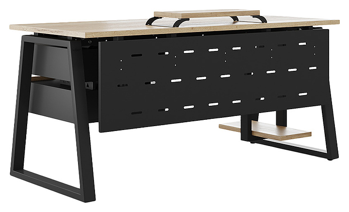 Офисный стол Кобор TR-160/80 black/natural используется в офисных помещениях и кабинетах руководителей. Модель оснащена опорами в форме трапеции. Каркас выполнен из металла, выкрашенного в цвет черный муар (RAL9005), столешница – из ламинированной древесно-стружечной плиты (ЛДСП) цвета натуральный дуб (H1180 ST37). Опции (заказываются отдельно):