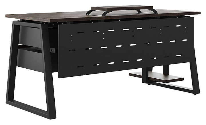 Офисный стол Кобор TR-120/70 black/charlston используется в офисных помещениях и кабинетах руководителей. Модель оснащена опорами в форме трапеции. Каркас выполнен из металла, выкрашенного в цвет черный муар (RAL9005), столешница – из ламинированной древесно-стружечной плиты (ЛДСП) цвета дуб чарльстон (H3154 ST36). Опции (заказываются отдельно):
