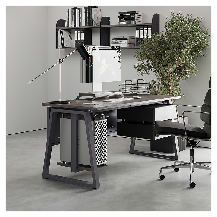 Офисный стол Кобор TR-100/80 graphite/chicago используется в офисных помещениях и кабинетах руководителей. Модель оснащена опорами в форме трапеции. Каркас выполнен из металла, выкрашенного в цвет графит муар (RAL7024), столешница – из ламинированной древесно-стружечной плиты (ЛДСП) цвета бетон чикаго (F186 ST9). Опции (заказываются отдельно):