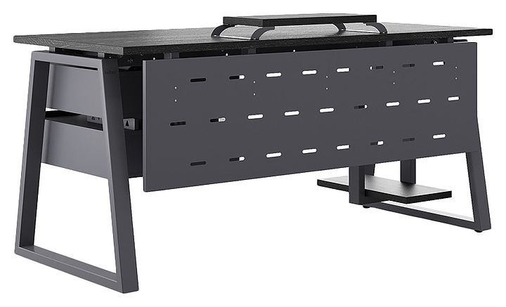 Офисный стол Кобор TR-80/80 graphite/glazed используется в офисных помещениях и кабинетах руководителей. Модель оснащена опорами в форме трапеции. Каркас выполнен из металла, выкрашенного в цвет графит муар (RAL7024), столешница – из ламинированной древесно-стружечной плиты (ЛДСП) цвета черный дуб (H3178 ST37). Опции (заказываются отдельно):