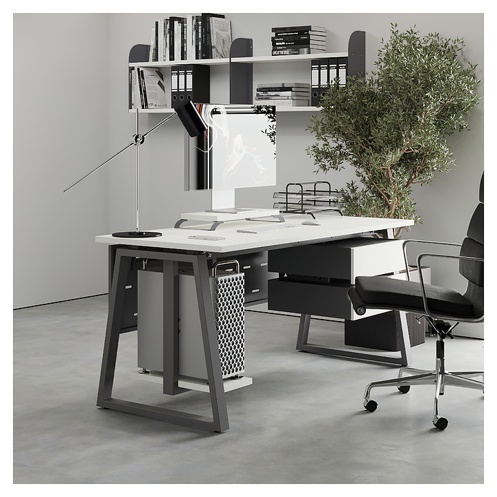 Офисный стол Кобор TR-80/80 aluminum/premium используется в офисных помещениях и кабинетах руководителей. Модель оснащена опорами в форме трапеции. Каркас выполнен из металла, выкрашенного в цвет алюминиевый металлик (RAL9006), столешница – из ламинированной древесно-стружечной плиты (ЛДСП) цвета белый премиум (W1000 ST9). Опции (заказываются отдельно):