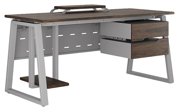 Офисный стол Кобор TR-80/80 aluminum/charlston используется в офисных помещениях и кабинетах руководителей. Модель оснащена опорами в форме трапеции. Каркас выполнен из металла, выкрашенного в цвет алюминиевый металлик (RAL9006), столешница – из ламинированной древесно-стружечной плиты (ЛДСП) цвета дуб чарльстон (H3154 ST36). Опции (заказываются отдельно):