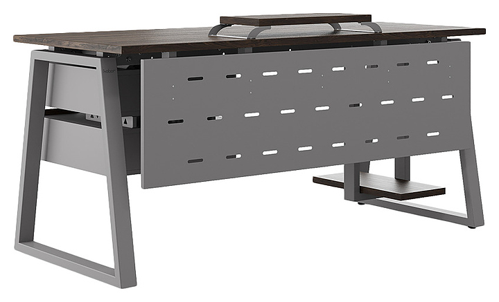 Офисный стол Кобор TR-160/80 aluminum/charlston используется в офисных помещениях и кабинетах руководителей. Модель оснащена опорами в форме трапеции. Каркас выполнен из металла, выкрашенного в цвет алюминиевый металлик (RAL9006), столешница – из ламинированной древесно-стружечной плиты (ЛДСП) цвета дуб чарльстон (H3154 ST36). Опции (заказываются отдельно):