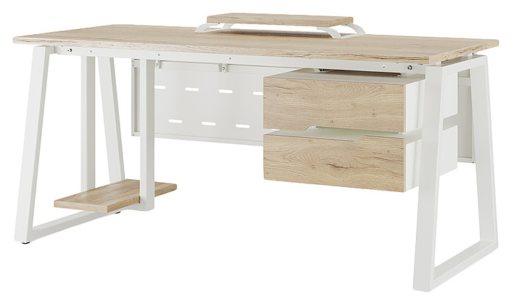 Офисный стол Кобор TR-180/70 white/natural используется в офисных помещениях и кабинетах руководителей. Модель оснащена опорами в форме трапеции. Каркас выполнен из металла, выкрашенного в цвет белый муар (RAL9016), столешница – из ламинированной древесно-стружечной плиты (ЛДСП) цвета натуральный дуб (H1180 ST37). Опции (заказываются отдельно):