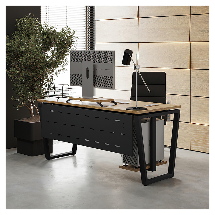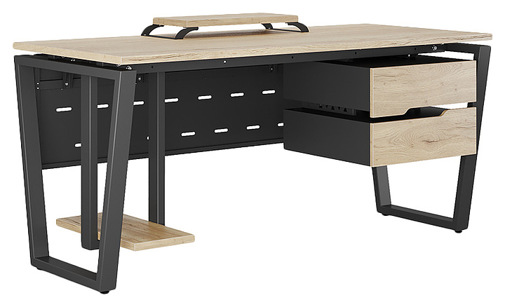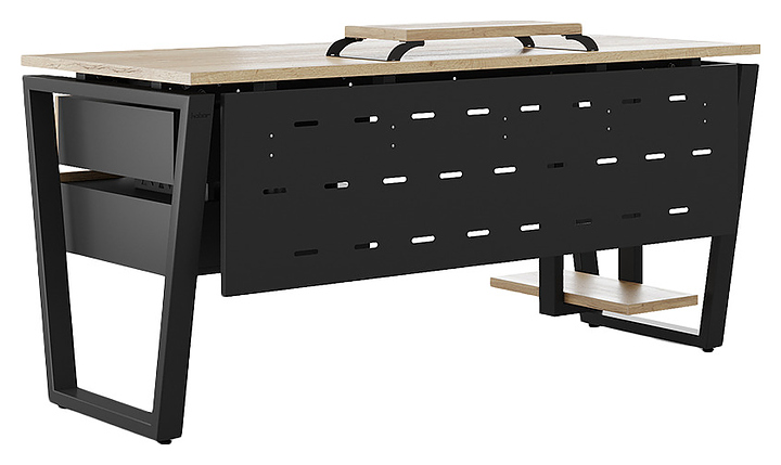 Офисный стол Кобор OTR-140/80 black/natural используется в офисных помещениях и кабинетах руководителей. Модель оснащена опорами в форме обратной трапеции. Каркас выполнен из металла, выкрашенного в цвет черный муар (RAL9005), столешница – из ламинированной древесно-стружечной плиты (ЛДСП) цвета натуральный дуб (H1180 ST37). Опции (заказываются отдельно):