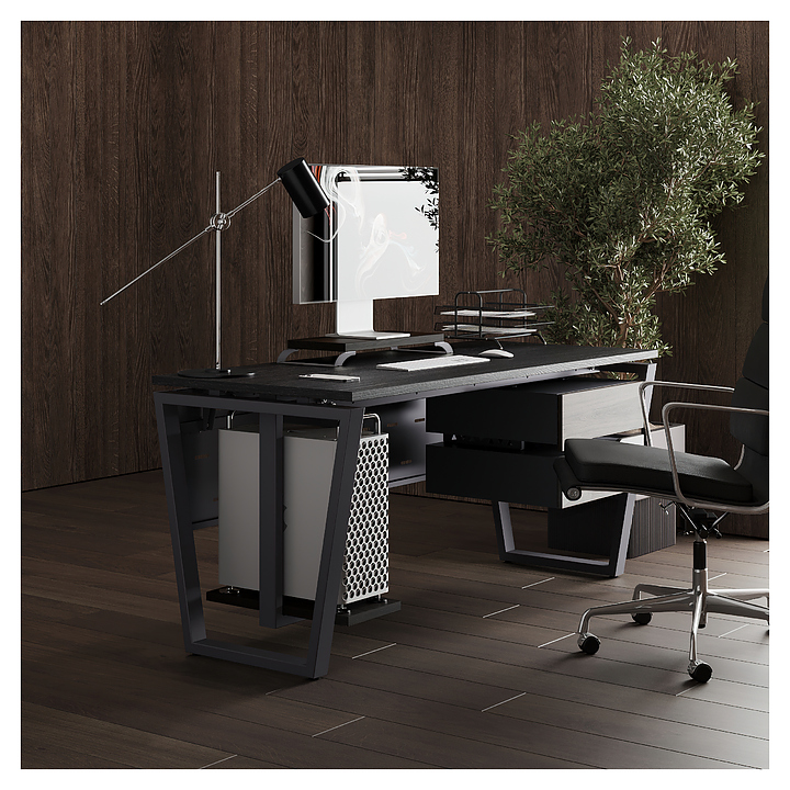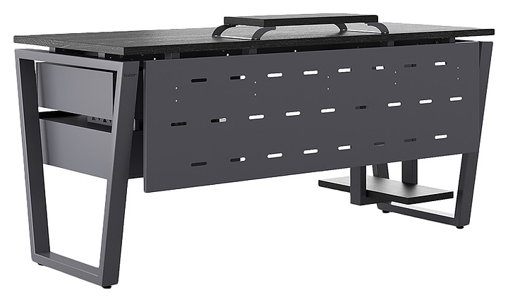 Офисный стол Кобор OTR-180/60 graphite/glazed используется в офисных помещениях и кабинетах руководителей. Модель оснащена опорами в форме обратной трапеции. Каркас выполнен из металла, выкрашенного в цвет графит муар (RAL7024), столешница – из ламинированной древесно-стружечной плиты (ЛДСП) цвета черный дуб (H3178 ST37). Опции (заказываются отдельно):