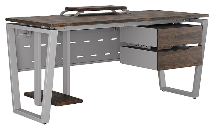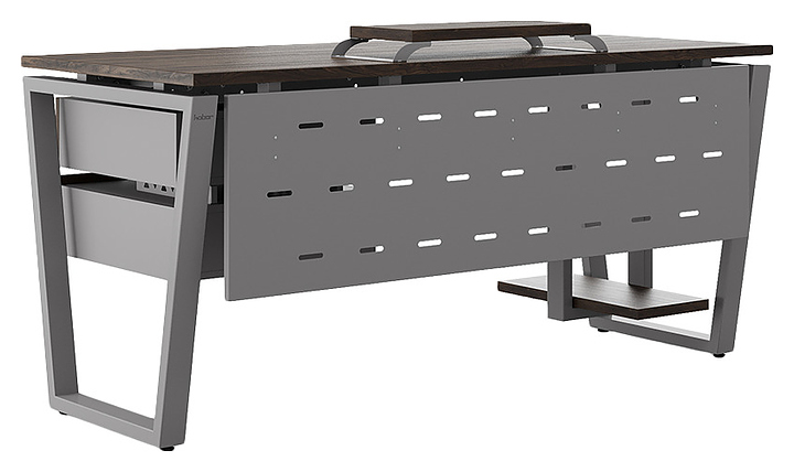 Офисный стол Кобор OTR-120/70 aluminum/charlston используется в офисных помещениях и кабинетах руководителей. Модель оснащена опорами в форме обратной трапеции. Каркас выполнен из металла, выкрашенного в цвет алюминиевый металлик (RAL9006), столешница – из ламинированной древесно-стружечной плиты (ЛДСП) цвета дуб чарльстон (H3154 ST36). Опции (заказываются отдельно):