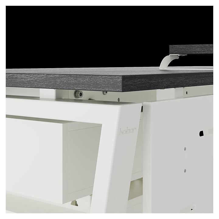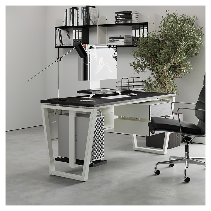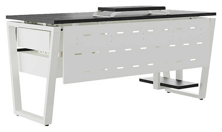Офисный стол Кобор OTR-160/60 white/glazed используется в офисных помещениях и кабинетах руководителей. Модель оснащена опорами в форме обратной трапеции. Каркас выполнен из металла, выкрашенного в цвет белый муар (RAL9016), столешница – из ламинированной древесно-стружечной плиты (ЛДСП) цвета черный дуб (H3178 ST37). Опции (заказываются отдельно):
