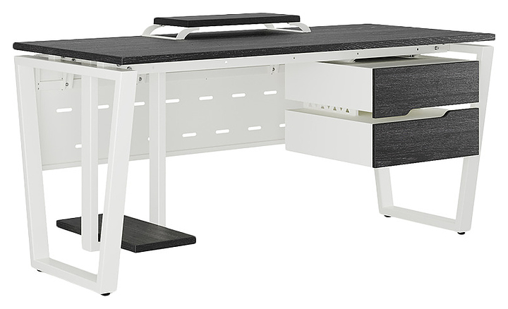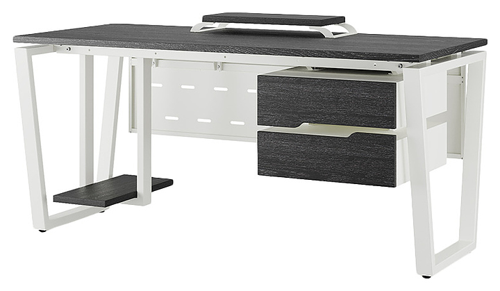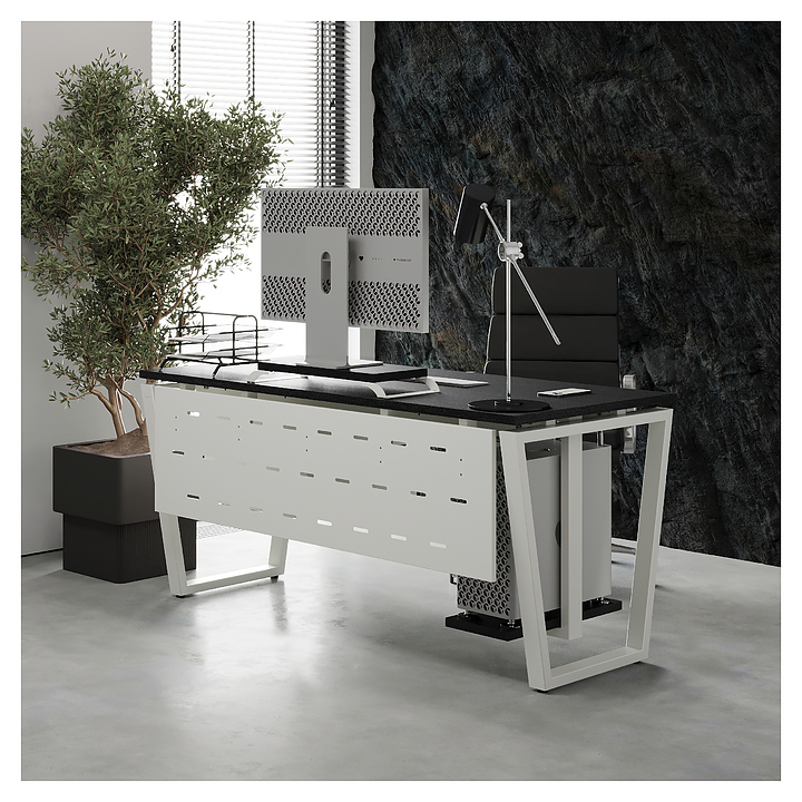 Офисный стол Кобор OTR-180/60 white/glazed используется в офисных помещениях и кабинетах руководителей. Модель оснащена опорами в форме обратной трапеции. Каркас выполнен из металла, выкрашенного в цвет белый муар (RAL9016), столешница – из ламинированной древесно-стружечной плиты (ЛДСП) цвета черный дуб (H3178 ST37). Опции (заказываются отдельно):