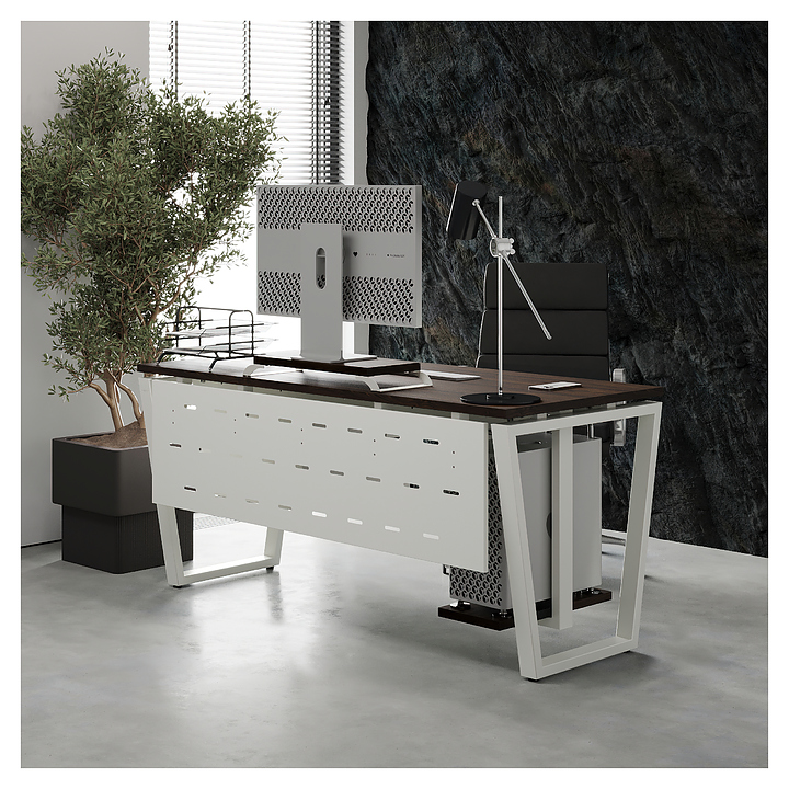 Офисный стол Кобор OTR-160/70 white/charlston используется в офисных помещениях и кабинетах руководителей. Модель оснащена опорами в форме обратной трапеции. Каркас выполнен из металла, выкрашенного в цвет белый муар (RAL9016), столешница – из ламинированной древесно-стружечной плиты (ЛДСП) цвета дуб чарльстон (H3154 ST36). Опции (заказываются отдельно):