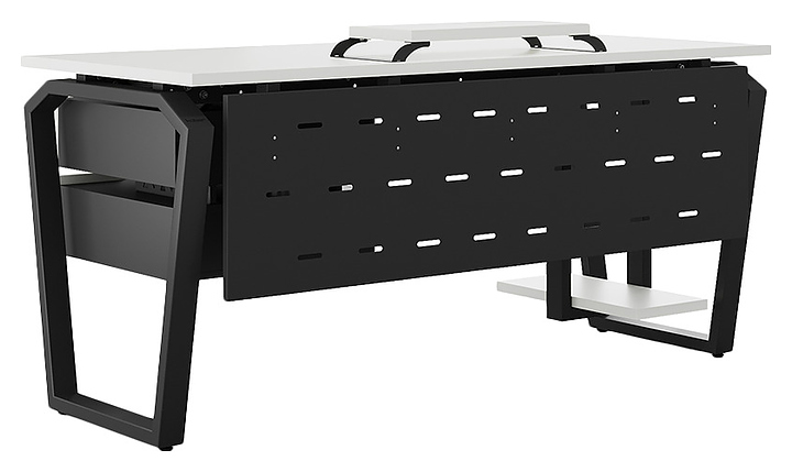 Офисный стол Кобор TB-80/80 black/premium используется в офисных помещениях и кабинетах руководителей. Модель оснащена опорами в форме обратной трапеции со скошенными верхними углами. Каркас выполнен из металла, выкрашенного в цвет черный муар (RAL9005), столешница – из ламинированной древесно-стружечной плиты (ЛДСП) цвета белый премиум (W1000 S9). Опции (заказываются отдельно):