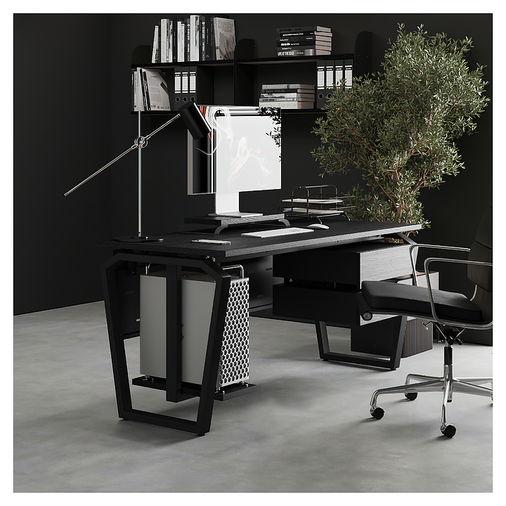 Офисный стол Кобор TB-80/80 black/glazed используется в офисных помещениях и кабинетах руководителей. Модель оснащена опорами в форме обратной трапеции со скошенными верхними углами. Каркас выполнен из металла, выкрашенного в цвет черный муар (RAL9005), столешница – из ламинированной древесно-стружечной плиты (ЛДСП) цвета черный дуб (H3178 ST37). Опции (заказываются отдельно):
