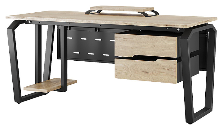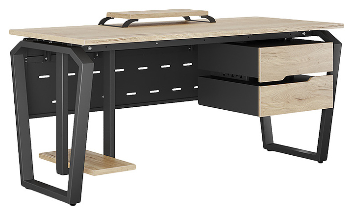 Офисный стол Кобор TB-140/70 black/natural используется в офисных помещениях и кабинетах руководителей. Модель оснащена опорами в форме обратной трапеции со скошенными верхними углами. Каркас выполнен из металла, выкрашенного в цвет черный муар (RAL9005), столешница – из ламинированной древесно-стружечной плиты (ЛДСП) цвета натуральный дуб (H1180 ST37). Опции (заказываются отдельно):