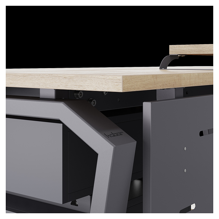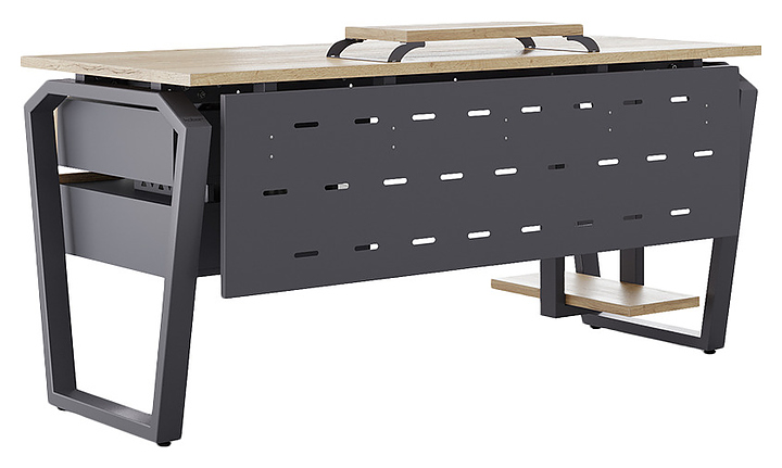 Офисный стол Кобор TB-100/60 graphite/natural используется в офисных помещениях и кабинетах руководителей. Модель оснащена опорами в форме обратной трапеции со скошенными верхними углами. Каркас выполнен из металла, выкрашенного в цвет графит муар (RAL7024), столешница – из ламинированной древесно-стружечной плиты (ЛДСП) цвета натуральный дуб (H1180 ST37). Опции (заказываются отдельно):