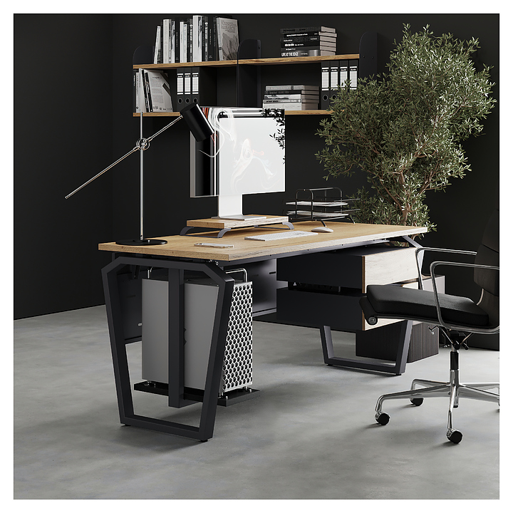 Офисный стол Кобор TB-120/70 graphite/natural используется в офисных помещениях и кабинетах руководителей. Модель оснащена опорами в форме обратной трапеции со скошенными верхними углами. Каркас выполнен из металла, выкрашенного в цвет графит муар (RAL7024), столешница – из ламинированной древесно-стружечной плиты (ЛДСП) цвета натуральный дуб (H1180 ST37). Опции (заказываются отдельно):