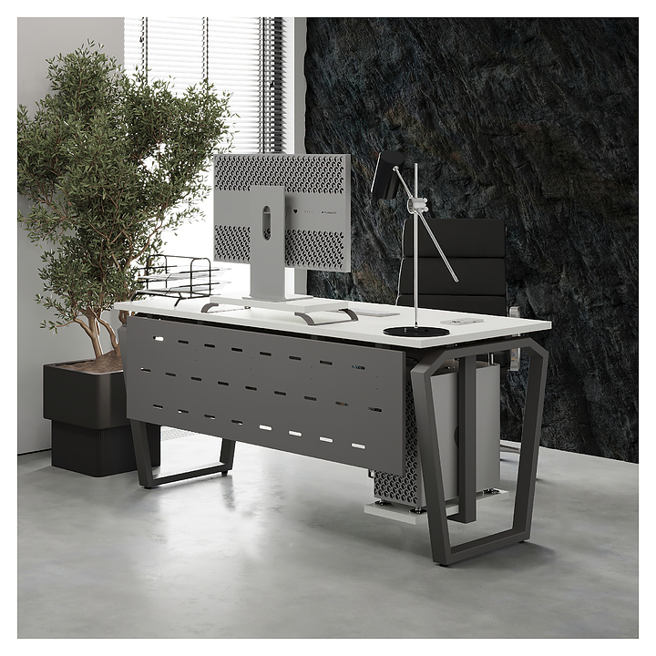Офисный стол Кобор TB-100/70 aluminum/premium используется в офисных помещениях и кабинетах руководителей. Модель оснащена опорами в форме обратной трапеции со скошенными верхними углами. Каркас выполнен из металла, выкрашенного в цвет алюминиевый металлик (RAL9006), столешница – из ламинированной древесно-стружечной плиты (ЛДСП) цвета белый премиум (W1000 ST9). Опции (заказываются отдельно):