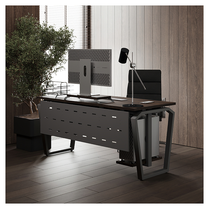 Офисный стол Кобор TB-100/60 aluminum/charlston используется в офисных помещениях и кабинетах руководителей. Модель оснащена опорами в форме обратной трапеции со скошенными верхними углами. Каркас выполнен из металла, выкрашенного в цвет алюминиевый металлик (RAL9006), столешница – из ламинированной древесно-стружечной плиты (ЛДСП) цвета дуб чарльстон (H3154 ST36). Опции (заказываются отдельно):