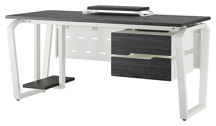 Офисный стол Кобор TB-140/80 white/glazed используется в офисных помещениях и кабинетах руководителей. Модель оснащена опорами в форме обратной трапеции со скошенными верхними углами. Каркас выполнен из металла, выкрашенного в цвет белый муар (RAL9016), столешница – из ламинированной древесно-стружечной плиты (ЛДСП) цвета черный дуб (H3178 ST37). Опции (заказываются отдельно):