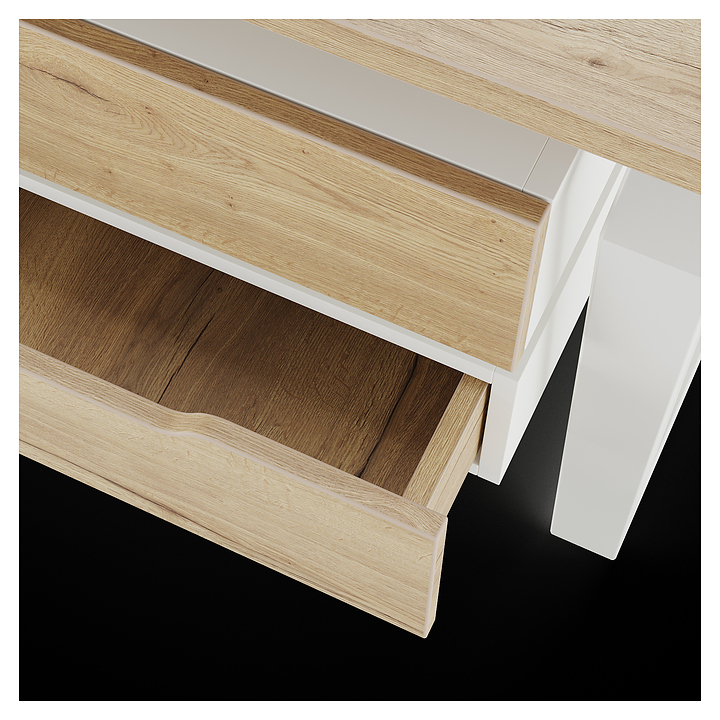 Офисный стол Кобор TB-100/70 white/natural используется в офисных помещениях и кабинетах руководителей. Модель оснащена опорами в форме обратной трапеции со скошенными верхними углами. Каркас выполнен из металла, выкрашенного в цвет белый муар (RAL9016), столешница – из ламинированной древесно-стружечной плиты (ЛДСП) цвета натуральный дуб (H1180 ST37). Опции (заказываются отдельно):