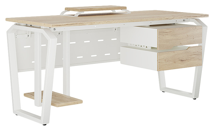 Офисный стол Кобор TB-140/70 white/natural используется в офисных помещениях и кабинетах руководителей. Модель оснащена опорами в форме обратной трапеции со скошенными верхними углами. Каркас выполнен из металла, выкрашенного в цвет белый муар (RAL9016), столешница – из ламинированной древесно-стружечной плиты (ЛДСП) цвета натуральный дуб (H1180 ST37). Опции (заказываются отдельно):