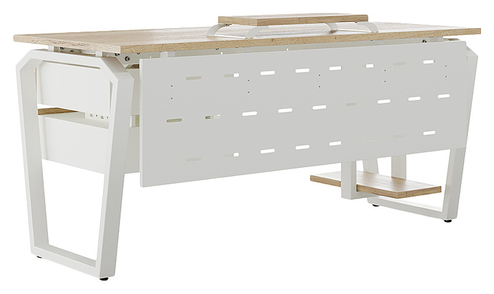 Офисный стол Кобор TB-160/80 white/natural используется в офисных помещениях и кабинетах руководителей. Модель оснащена опорами в форме обратной трапеции со скошенными верхними углами. Каркас выполнен из металла, выкрашенного в цвет белый муар (RAL9016), столешница – из ламинированной древесно-стружечной плиты (ЛДСП) цвета натуральный дуб (H1180 ST37). Опции (заказываются отдельно):