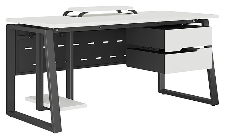 Офисный стол Кобор TS1-140/80 black/premium используется в офисных помещениях и кабинетах руководителей. Модель оснащена опорами в форме наклонной трапеции. Каркас выполнен из металла, выкрашенного в цвет черный муар (RAL9005), столешница – из ламинированной древесно-стружечной плиты (ЛДСП) цвета белый премиум (W1000 S9). Опции (заказываются отдельно):