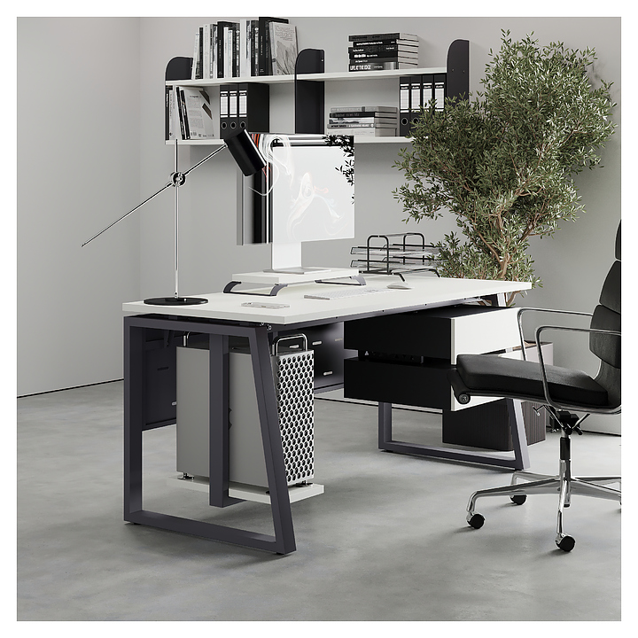 Офисный стол Кобор TS1-140/70 graphite/premium используется в офисных помещениях и кабинетах руководителей. Модель оснащена опорами в форме наклонной трапеции. Каркас выполнен из металла, выкрашенного в цвет графит муар (RAL7024), столешница – из ламинированной древесно-стружечной плиты (ЛДСП) цвета белый премиум (W1000 ST9). Опции (заказываются отдельно):