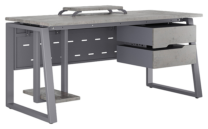Офисный стол Кобор TS1-120/60 graphite/chicago используется в офисных помещениях и кабинетах руководителей. Модель оснащена опорами в форме наклонной трапеции. Каркас выполнен из металла, выкрашенного в цвет графит муар (RAL7024), столешница – из ламинированной древесно-стружечной плиты (ЛДСП) цвета бетон чикаго (F186 ST9). Опции (заказываются отдельно):