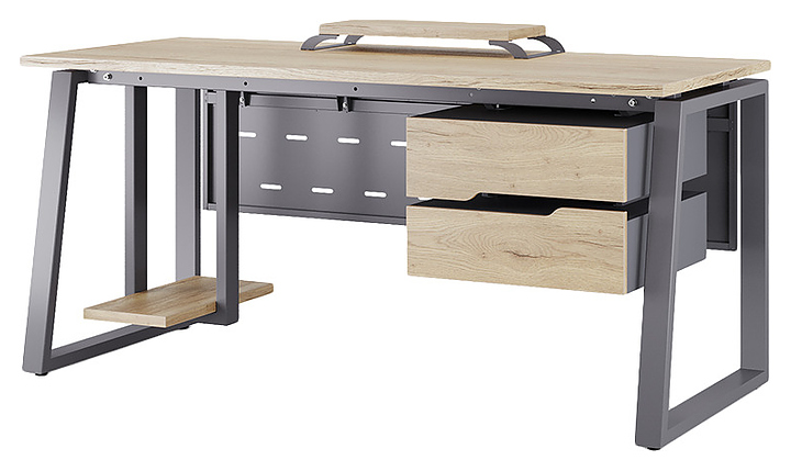 Офисный стол Кобор TS1-180/60 graphite/natural используется в офисных помещениях и кабинетах руководителей. Модель оснащена опорами в форме наклонной трапеции. Каркас выполнен из металла, выкрашенного в цвет графит муар (RAL7024), столешница – из ламинированной древесно-стружечной плиты (ЛДСП) цвета натуральный дуб (H1180 ST37). Опции (заказываются отдельно):