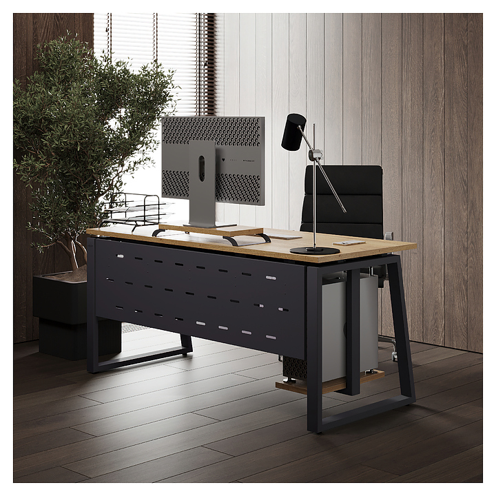 Офисный стол Кобор TS1-120/80 graphite/natural используется в офисных помещениях и кабинетах руководителей. Модель оснащена опорами в форме наклонной трапеции. Каркас выполнен из металла, выкрашенного в цвет графит муар (RAL7024), столешница – из ламинированной древесно-стружечной плиты (ЛДСП) цвета натуральный дуб (H1180 ST37). Опции (заказываются отдельно):