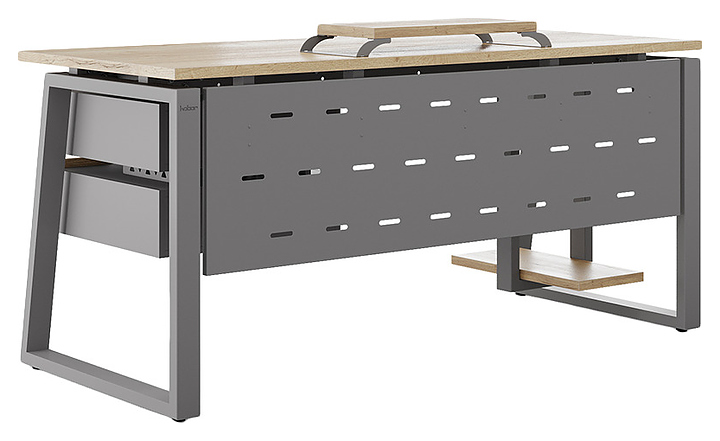 Офисный стол Кобор TS1-140/80 aluminum/natural используется в офисных помещениях и кабинетах руководителей. Модель оснащена опорами в форме наклонной трапеции. Каркас выполнен из металла, выкрашенного в цвет алюминиевый металлик (RAL9006), столешница – из ламинированной древесно-стружечной плиты (ЛДСП) цвета натуральный дуб (H1180 ST37). Опции (заказываются отдельно):