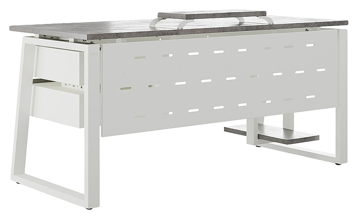 Офисный стол Кобор TS1-140/70 white/chicago используется в офисных помещениях и кабинетах руководителей. Модель оснащена опорами в форме наклонной трапеции. Каркас выполнен из металла, выкрашенного в цвет белый муар (RAL9016), столешница – из ламинированной древесно-стружечной плиты (ЛДСП) цвета бетон чикаго (F186 ST9). Опции (заказываются отдельно):