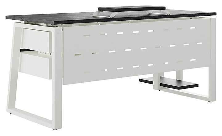 Офисный стол Кобор TS1-140/60 white/glazed используется в офисных помещениях и кабинетах руководителей. Модель оснащена опорами в форме наклонной трапеции. Каркас выполнен из металла, выкрашенного в цвет белый муар (RAL9016), столешница – из ламинированной древесно-стружечной плиты (ЛДСП) цвета черный дуб (H3178 ST37). Опции (заказываются отдельно):