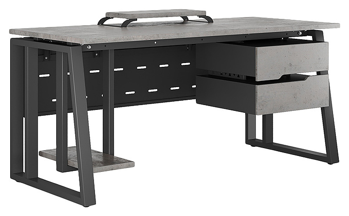 Офисный стол Кобор TS2-100/60 black/chicago используется в офисных помещениях и кабинетах руководителей. Модель оснащена усиленными вертикальными балками опорами в форме наклонной трапеции. Каркас выполнен из металла, выкрашенного в цвет черный муар (RAL9005), столешница – из ламинированной древесно-стружечной плиты (ЛДСП) цвета бетон чикаго (F186 ST9). Опции (заказываются отдельно):