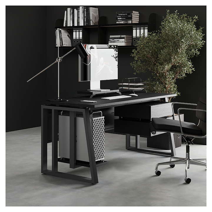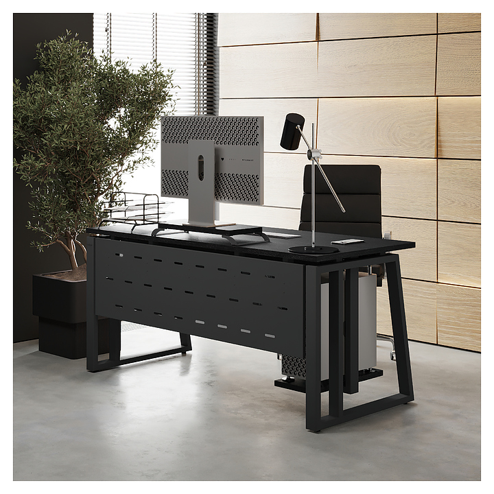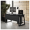 Офисный стол Кобор TS2-120/80 black/glazed используется в офисных помещениях и кабинетах руководителей. Модель оснащена усиленными вертикальными балками опорами в форме наклонной трапеции. Каркас выполнен из металла, выкрашенного в цвет черный муар (RAL9005), столешница – из ламинированной древесно-стружечной плиты (ЛДСП) цвета черный дуб (H3178 ST37). Опции (заказываются отдельно):