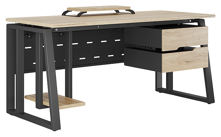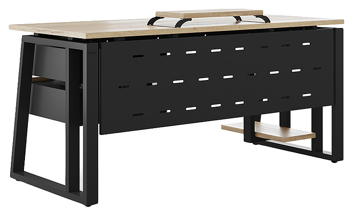 Офисный стол Кобор TS2-100/80 black/natural используется в офисных помещениях и кабинетах руководителей. Модель оснащена усиленными вертикальными балками опорами в форме наклонной трапеции. Каркас выполнен из металла, выкрашенного в цвет черный муар (RAL9005), столешница – из ламинированной древесно-стружечной плиты (ЛДСП) цвета натуральный дуб (H1180 ST37). Опции (заказываются отдельно):
